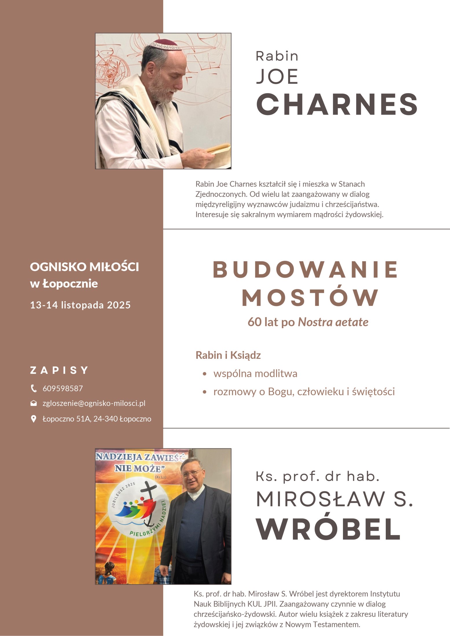 W dniach 13-14 listopada 2025 r. odbędzie się spotkanie zatytułowane „Budowanie Mostów – 60 lat po Nostra aetate” z udziałem rabina, p. Joe Charnesa oraz ks. prof. Mirosław S. Wróbel. Spotkanie będzie miało miejsce domu Ogniska Miłości w Łopocznie.