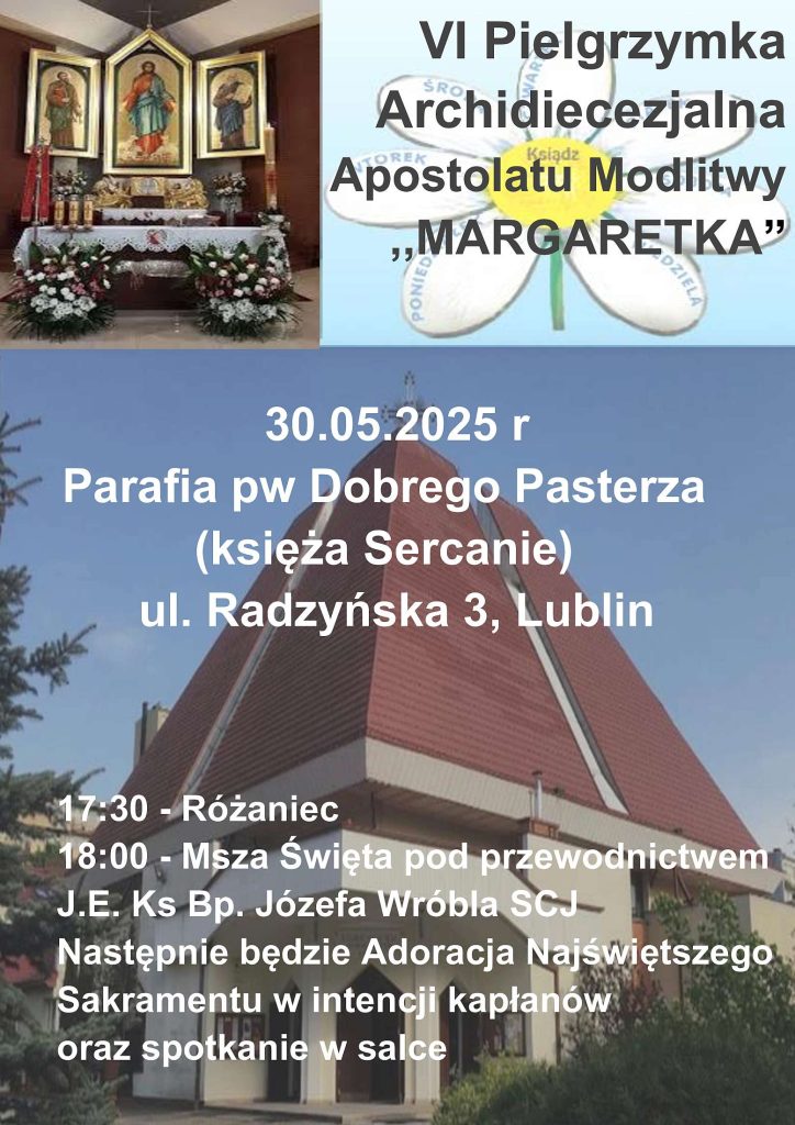 W piątek, 30 maja 2024 r odbędzie się szósta diecezjalna pielgrzymka Apostolatu Modlitwy za Kapłanów „Margaretka”. Spotkanie odbędzie się w kościele parafialnym pod wezwaniem Dobrego Pasterza w Lublinie (ul. Radzyńska 3)
