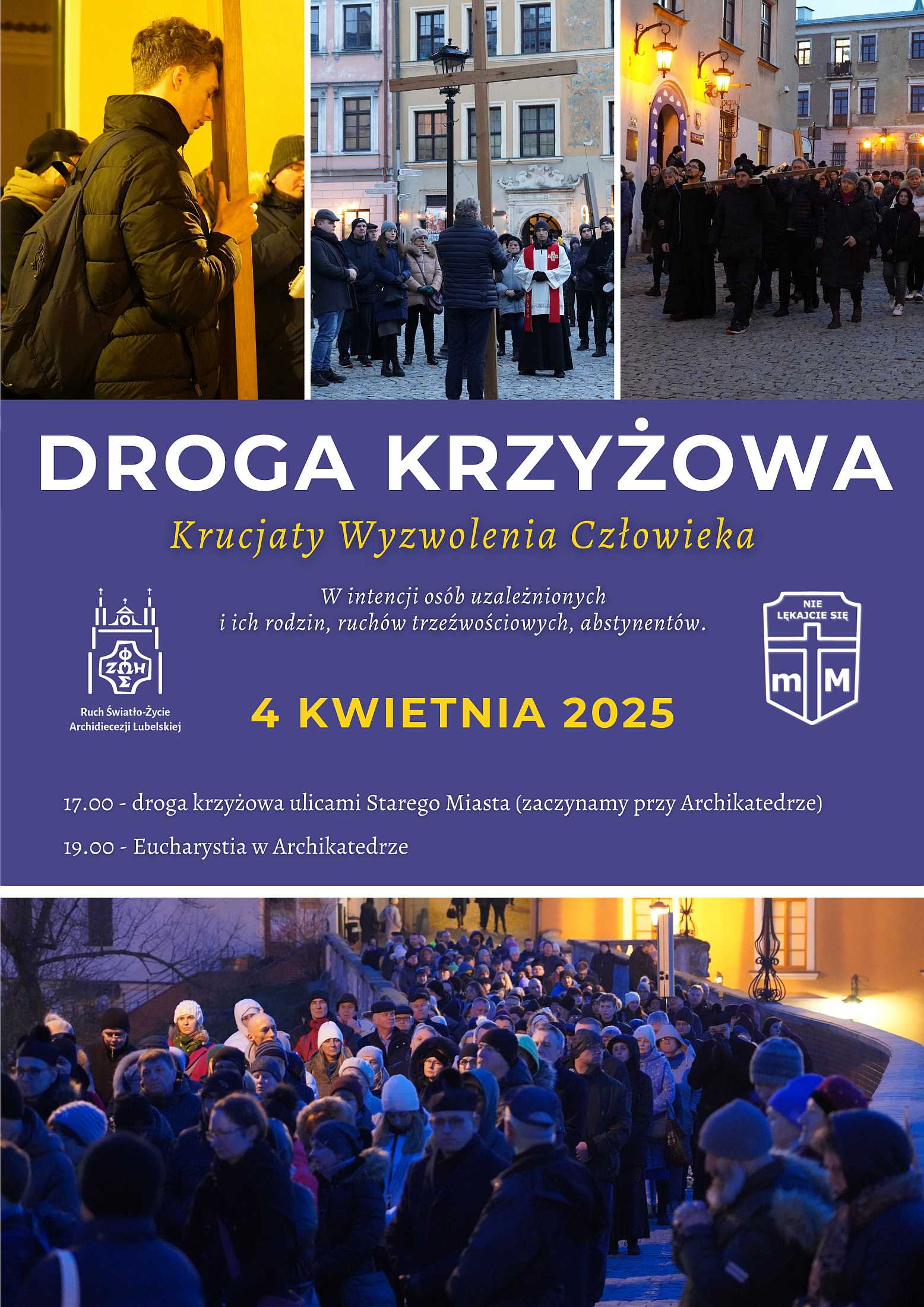 Krucjata Wyzwolenia Człowieka Ruchu Światło-Życie (KWC) zaprasza 4 kwietnia 2025 r. (piątek) o godz. 17.00 na Drogę krzyżową ulicami Starego Miasta w intencji osób uzależnionych, ich rodzin i bliskich, w intencji abstynentów i grup trzeźwości. Po jej zakończeniu Eucharystia w archikatedrze o godz. 19.00.