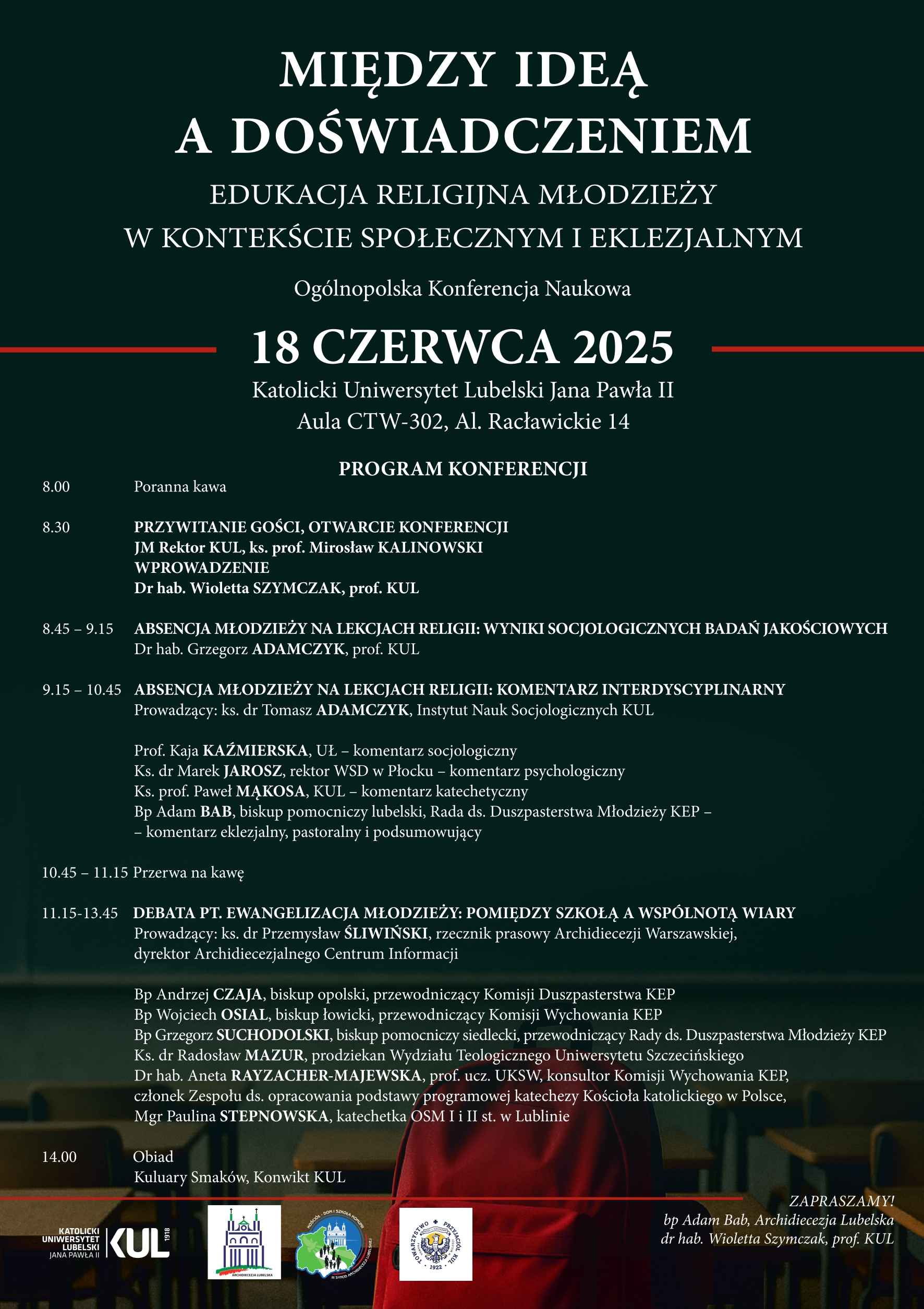 W środę, 18 czerwca 2025 r., na Katolickim Uniwersytecie Lubelskim Jana Pawła II odbędzie się Ogólnopolska Konferencja Naukowa „Między ideą a doświadczeniem. Edukacja religijna młodzieży w kontekście społecznym i eklezjalnym”.