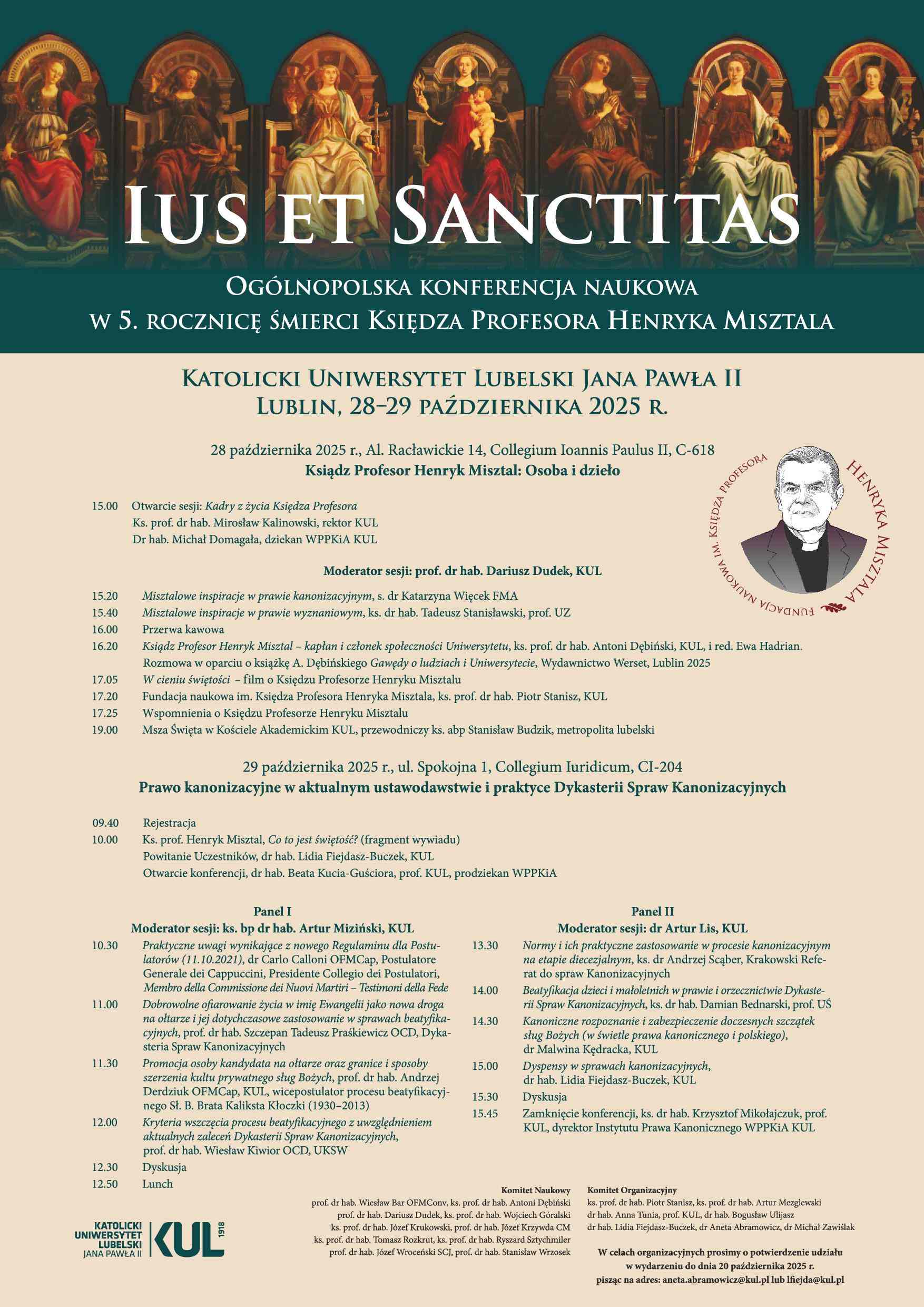 Ius et Sanctitas – Ogólnopolska Konferencja Naukowa – KUL: 28-29.10.2025 Aktualności, Strona główna W dniach 28-29 października 2025 r. w Katolickim Uniwersytecie Lubelskim Jana Pawła II odbędzie się Ogólnopolska Konferencja Naukowa w 5. rocznicę śmierci księdza profesora Henryka Misztala – IUS ET SANCTITAS. Tweetuj