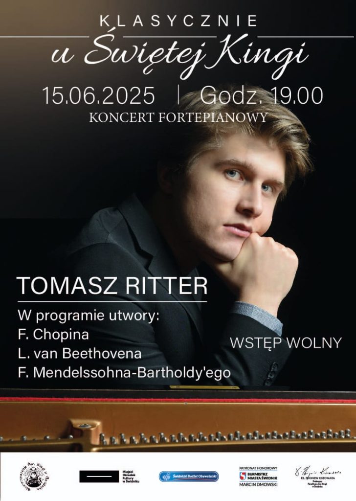 Parafia pw. św. Kingi w Świdniku i Stowarzyszenie Świętej Kingi zapraszają w niedzielę, 15 czerwca 2025 r., o godz. 19.00 na koncert „Koncert fortepianowy” w ramach cyklu „Klasycznie u Świętej Kingi”. Koncert odbędzie się w kościele parafialnym przy ul. Klonowej 16A w Świdniku. Wystąpi wirtuoz fortepianu Tomasz Ritter.