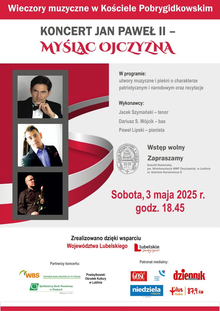 Kościół Rekroralny pw. Wniebowzięcia NMP Zwycięskiej w Lublinie, w ramach cyklu Wieczory muzyczne w Kościele Pobrygidkowskim, zaprasza w sobotę 3 maja 2025 r. o godz. 18.45 na: Koncert Jan Paweł II – Myśląc Ojczyzna.