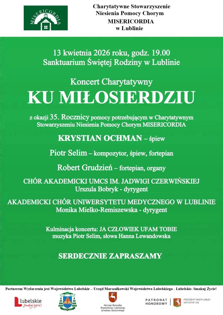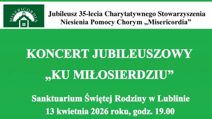 Z okazji Jubileuszu 35-lecia Charytatywnego Stowarzyszenia Niesienia Pomocy Chorym „Misericordia”, w poniedziałek 13 kwietnia 2026 roku, godz. 19.00, w Sanktuarium Świętej Rodziny w Lublinie, odbędzie się Koncert „Ku Miłosierdziu”.