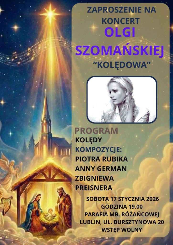 Parafia pw. Matki Bożej Różańcowej w Lublinie zaprasza na Koncert Olgi Szomańskiej „Kolędowa” który odbędzie się 17 stycznia 2026 r. (sobota) w kościele parafialnym – Sanktuarium Matki Bożej Latyczowskiej (Lublin, ul. Bursztynowa 20). Koncert rozpocznie się o godz. 19.00.