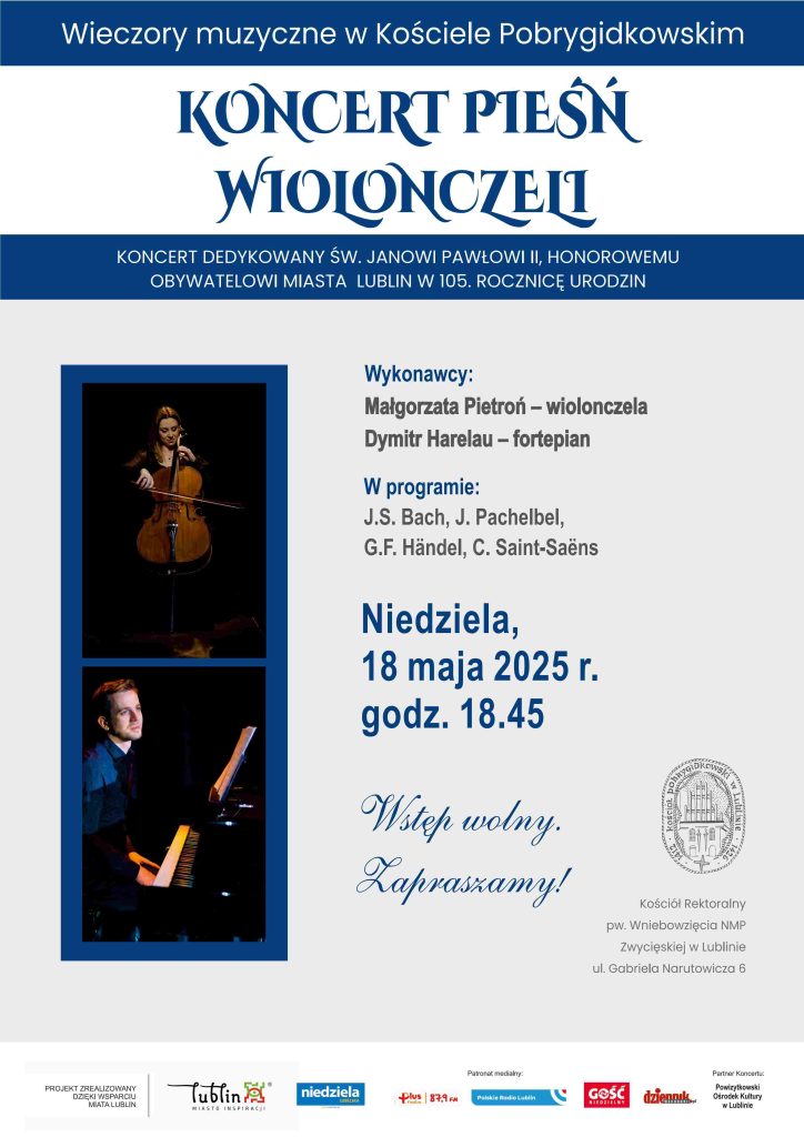 Kościół Rekroralny pw. Wniebowzięcia NMP Zwycięskiej w Lublinie, w ramach cyklu Wieczory muzyczne w Kościele Pobrygidkowskim, zaprasza w niedzielę 18 maja 2025 r. o godz. 18.45 na koncert: Pieśń Wiolonczeli. Koncert dedykowany św. Janowi Pawłowi II, Honorowemu Obywatelowi Miasta Lublin w 105. rocznicę urodzin.