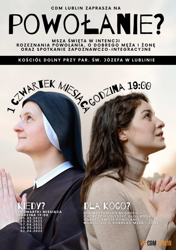 Cyklicznie, w pierwsze czwartki miesiąca, Centrum Duszpasterstwa Młodzieży (CDM) zaprasza na wspólną modlitwę o rozeznanie powołania, o dobrego męża i żonę. Spotkanie rozpoczyna się Mszą Świętą o godz. 19.00 w dolnym kościele parafii pw. św. Józefa w Lublinie (ul. Filaretów 7). Po Eucharystii wysłuchać można konferencji lub świadectw dotyczących życia małżeńskiego lub zakonnego oraz dróg rozeznawania powołania.
