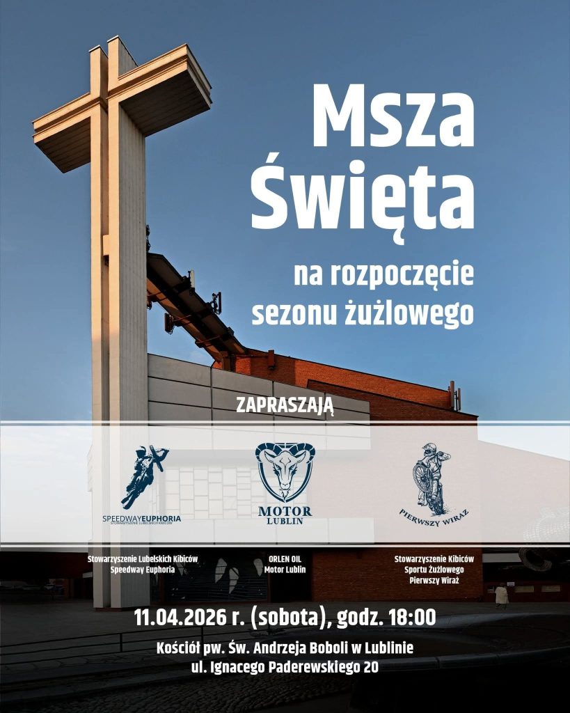 ORLEN OIL Motor Lublin, Stowarzyszenie Lubelskich Kibiców Speedway Euphoria i Stowarzyszenie Kibiców Sportu żużlowego Pierwszy Wiraż zapraszają, w sobotę 11 kwietnia 2026 r., na Mszę Święta na rozpoczęcie sezonu żużlowego, w kościele pw. św. Andrzeja Boboli w Lublinie (ul. Paderewskiego 20).