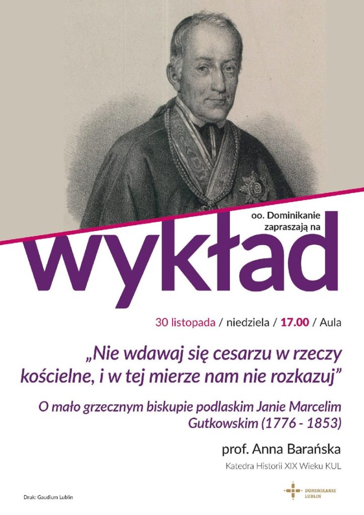 wykład zatytułowany: “Nie wdawaj się cesarzu w rzeczy kościelne, i w tej mierze nam nie rozkazuj”. O mało grzecznym biskupie podlaskim Janie Marcelim Gutkowskim (1776-1853) – prof. Anna Barańska, Katedra Historii XIX Wieku KUL.