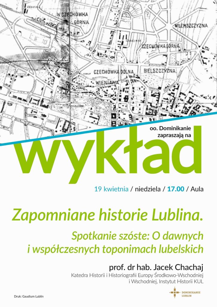 wykład: „Zapomniane historie Lublina. Spotkanie szóste: O dawnych i współczesnych toponimach lubelskich” – wygłosi prof. dr hab. Jacek Chachaj, Katedra Historii i Historiografii Europy Środkowo-Wschodniej i Wschodniej, Instytut Historii KUL.