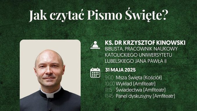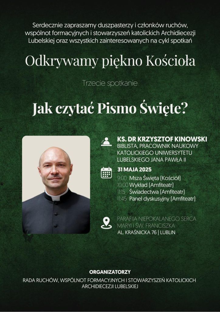 Spotkanie zatytułowane: Jak czytać Pismo Święte? odbędzie się 31 maja 2025 r. (sobota) o godz. 9.00 w parafii pw. Niepokalanego Serca Maryi i św. Franciszka w Lublinie – Poczekajka (Al. Kraśnicka 76). Gościem spotkania będzie ks. dr Krzysztof Kinowski, biblista.
