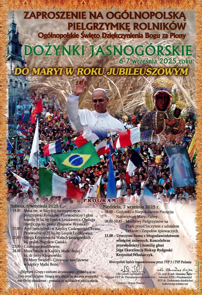 W dniach 6-7 września 2025 r. na Jasnej Górze odbędzie się Ogólnopolska Pielgrzymka Rolników oraz Ogólnopolskie Święto Dziękczynienia Bogu za Plony – Jasnogórskie Dożynki 2025. Tegoroczne obchody odbywać się będą pod hasłem: „Do Maryi w Roku Jubileuszowym”.