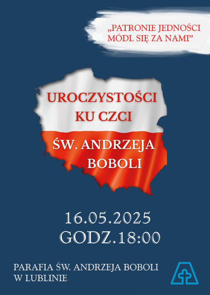 Parafia pw. św. Andrzeja Boboli w Lublinie zaprasza na Uroczystości Odpustowe ku czci św. Andrzeja Boboli, Patrona Polski, które odbędą się w najbliższy piątek 16 maja 2025 r. Uroczysta Msza święta pod przewodnictwem abp. Stanisława Budzika, metropolity lubelskiego, w kościele św. Andrzeja Boboli w Lublinie (ul. Paderewskiego 20), będzie sprawowana o godz. 18.00.