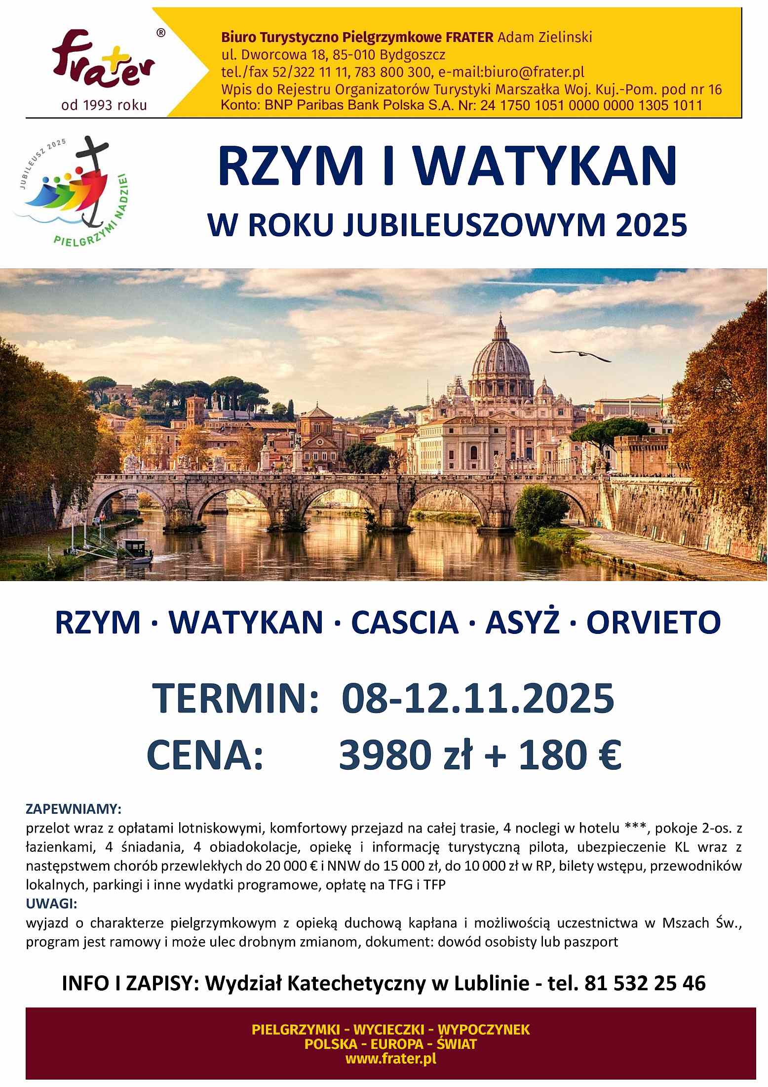 Pielgrzymka jubileuszowa nauczycieli i pracowników oświaty do Rzymu Aktualności, Strona główna Duszpasterstwo Nauczycieli Archidiecezji Lubelskiej zaprasza na Pielgrzymkę Jubileuszową do Rzymu w terminie 8-12 listopada 2025 r. Informacje i zapisy w Wydziale Katechetycznym: tel: 81 532 25 46 PROGRAM: pobierz Tweetuj