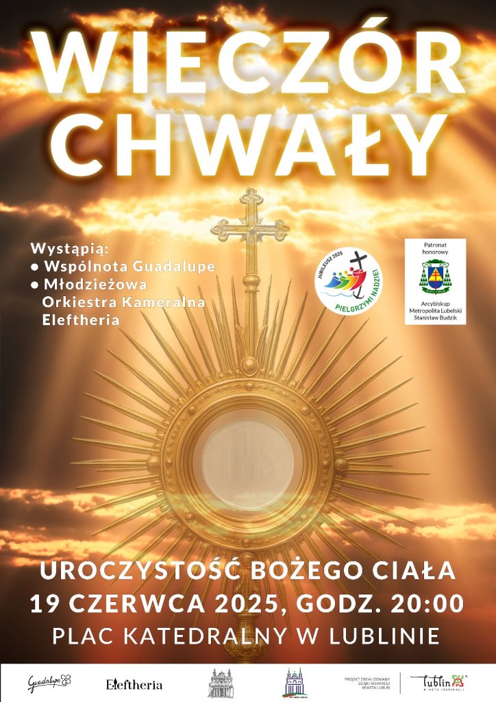 O godz. 20.00 na placu katedralnym „Wieczór Chwały”. Radosne uwielbienie Boga i adorację Chrystusa Eucharystycznego poprowadzi Wspólnota Guadalupe wraz z Młodzieżową Orkiestrą Kameralną „Eleftheria”.