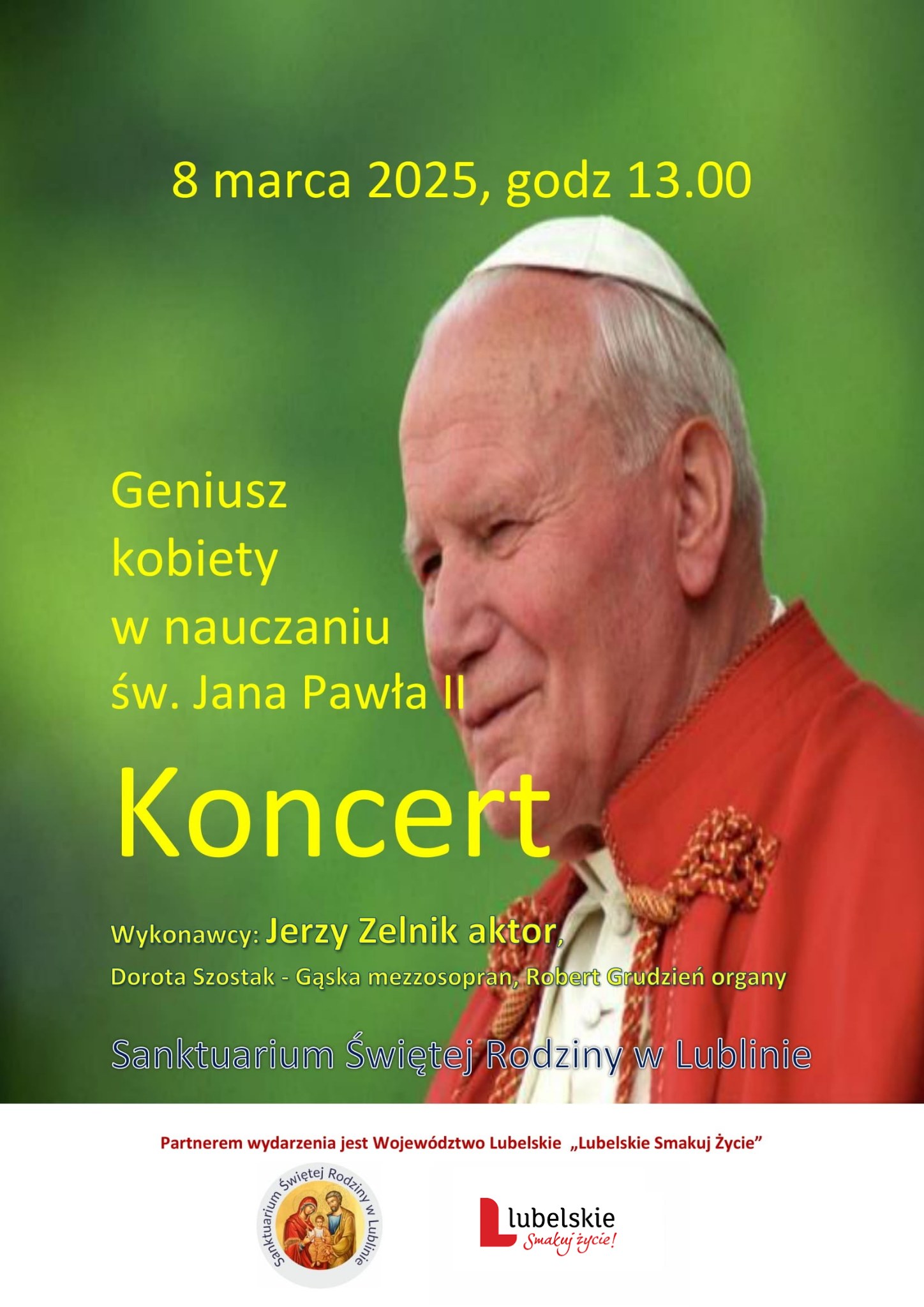 Po Mszy Świętej o godzinie 13.00 w kościele odbędzie się koncert pt. „Geniusz kobiety w nauczaniu Św. Jana Pawła II„.
