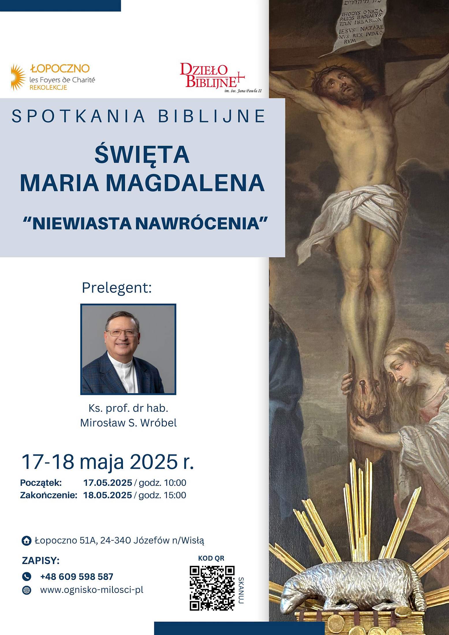 W dniach 17-18 maja 2025 r. Ognisko Światła i Miłości w Łopocznie i Dzieło Biblijne im. Jana Pawła II Archidiecezji Lubelskiej organizują spotkanie biblijne pt. „Święta Maria Magdalena – Niewiasta Nawrócenia”. Spotkanie poprowadzi ks. prof. Mirosław S. Wróbel.