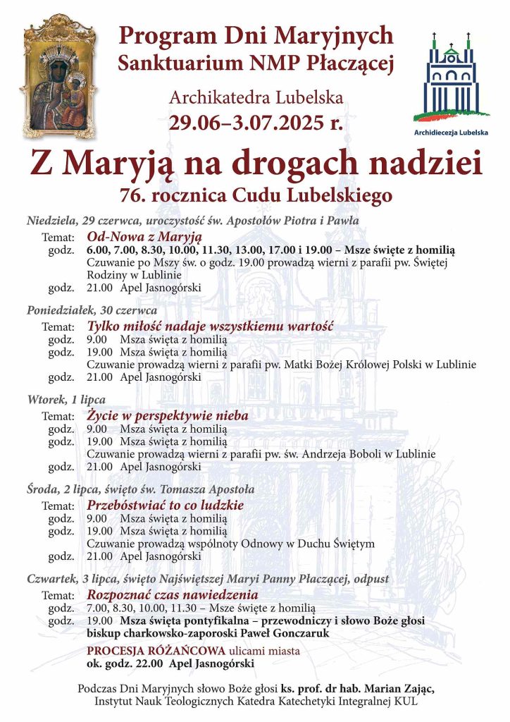Wieczorem 3 lipca 2025 r., na placu przed Archikatedrą Lubelską, rozpoczną się główne uroczystości w ramach obchodów święta Najświętszej Maryi Panny Płaczącej, ustanowionego w rocznicę „cudu lubelskiego” mającego miejsce 3 lipca 1949 r. Głównym punktem spotkania będzie Eucharystia o godz. 19.00 i procesja różańcowa z Obrazem Matki Bożej ulicami miasta.