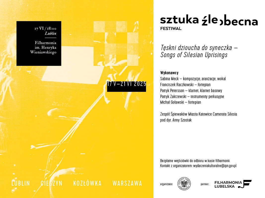Instytut Pamięci Narodowej zaprasza na koncert inaugurujący III edycję festiwalu Sztuka Źle Obecna, zatytułowany „Tęskni dzioucha do syneczka”, który odbędzie się 17 maja 2025 r. o godz. 18.00 w Filharmonii im. Henryka Wieniawskiego w Lublinie.