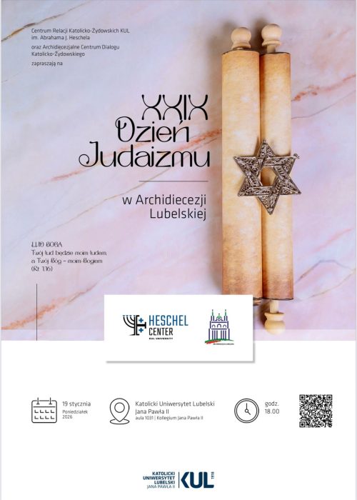 18.00 – XXIX Dzień Judaizmu w Archidiecezji Lubelskiej – CENTRUM RELACJI KATOLICKO-ŻYDOWSKICH KUL IM. ABRAHAMA J. HESCHELA oraz ARCHIDIECEZJALNE CENTRUM DIALOGU KATOLICKO-ŻYDOWSKIEGO: Lud Boga. „Twój lud będzie moim ludem, a Twój Bóg – moim Bogiem (Rt 1,16): (Al. Racławickie 14, Kolegium Jana Pawła II, X piętro, aula 1031)