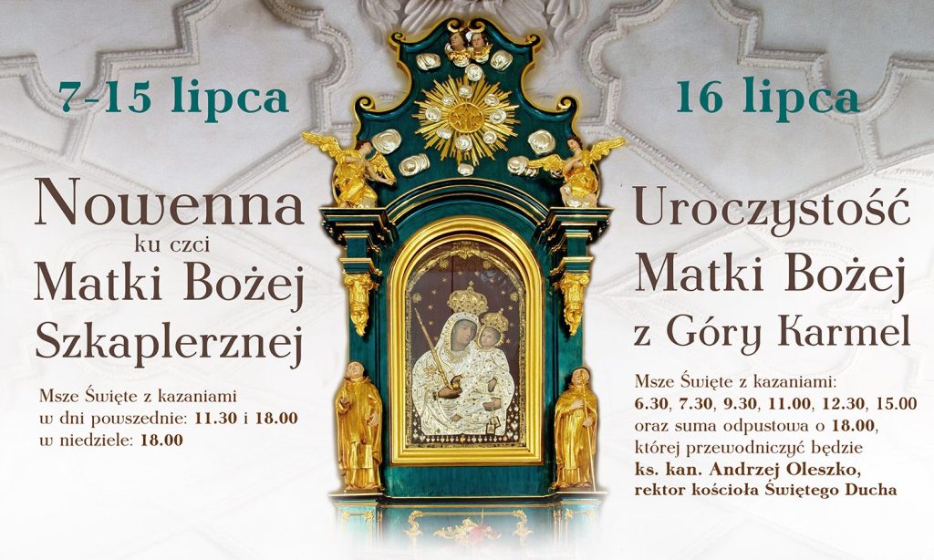 Msze Święte w środę, 16 lipca, będą sprawowane o godz.: 6.30, 7.30, 9.30, 11.00, 12.30, 15.00 i 18.00. Uroczystej sumie odpustowej o godzinie 18.00 będzie przewodniczył ks. Andrzej Oleszko, rektor kościoła pw. Świętego Ducha.