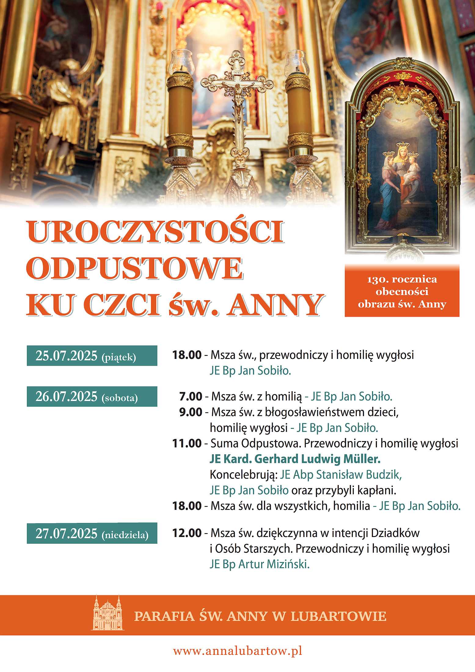Parafia pw. św. Anny w Lubartowie zaprasza na doroczne uroczystości ku czci św. Anny, patronki rodzin. Uroczystości odpustowe w Bazylice św. Anny w Lubartowie (ul. Słowackiego 6) będą miały miejsce w sobotę 26 lipca 2025 r. Sumie odpustowej o godz. 11.00 będzie przewodniczył i homilie wygłosi kard. Gerhard Ludwig Müller.