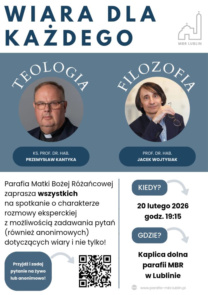 Parafia pw. Matki Bożej Różańcowej w Lublinie zaprasza w ramach projektu „Wiara dla każdego” zapraszamy w piątek 20 lutego 2026 r. o godz. 19.15 na kolejne spotkanie ze specjalistami z zakresu filozofii i teologii. Pytania na nurtujące tematy – dotyczące wiary i nie tylko – można zadawać wprost podczas spotkania lub wrzucając do skrzynki (anonimowo) oraz on-line.