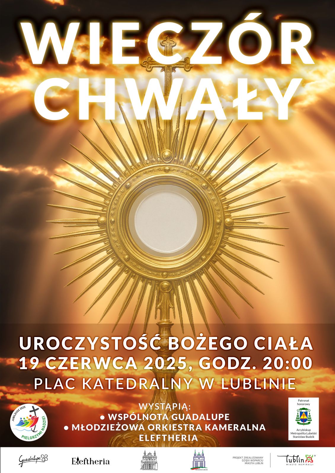 W uroczystości Bożego Ciała, 19 czerwca 2025 r., w Lublinie – na Placu Katedralnym, o godz. 20.00 rozpocznie się kolejny „Wieczór Chwały”. Radosne uwielbienie Boga i adorację Chrystusa Eucharystycznego poprowadzi Wspólnota Guadalupe wraz z Młodzieżową Orkiestrą Kameralną „Eleftheria”.
