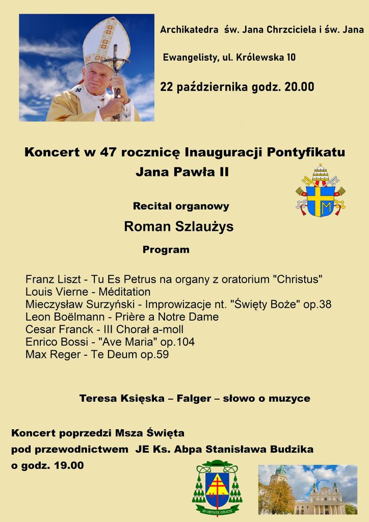 W środę, 22 października 2025 r., w liturgiczne wspomnienie św. Jana Pawła II i rocznicę inauguracji pontyfikatu Papieża Polaka, Eucharystii w archikatedrze lubelskiej o godz. 19.00 przewodniczyć będzie abp Stanisław Budzik. Po liturgii, o godz. 20.00, odbędzie się okolicznościowy koncert organowy Romana Szlaużysa.
