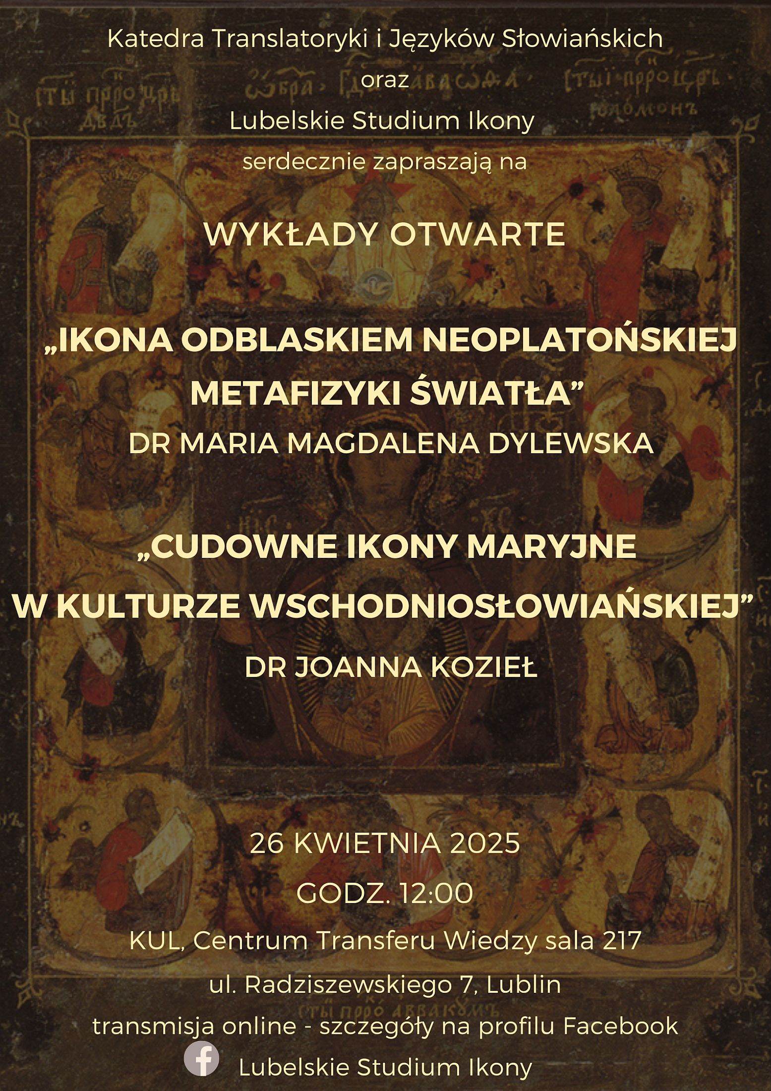 Katedra Translatoryki i Języków Słowiańskich KUL oraz Lubelskie Studium Ikony zapraszają na wykłady otwarte poświęcone filozofii i teologii ikony.