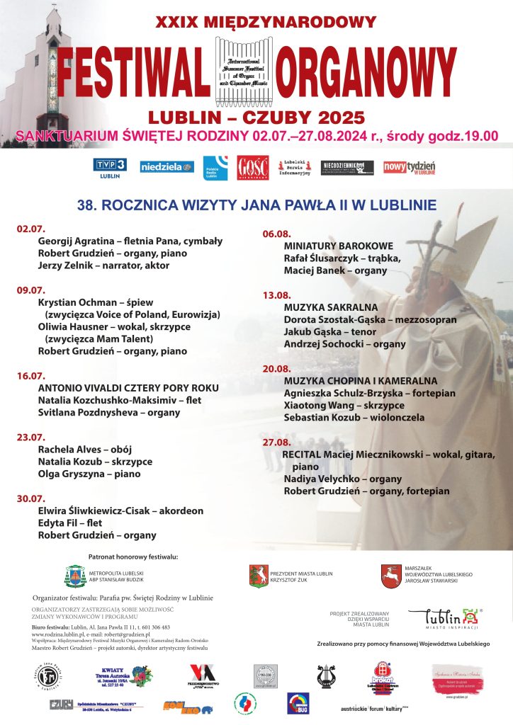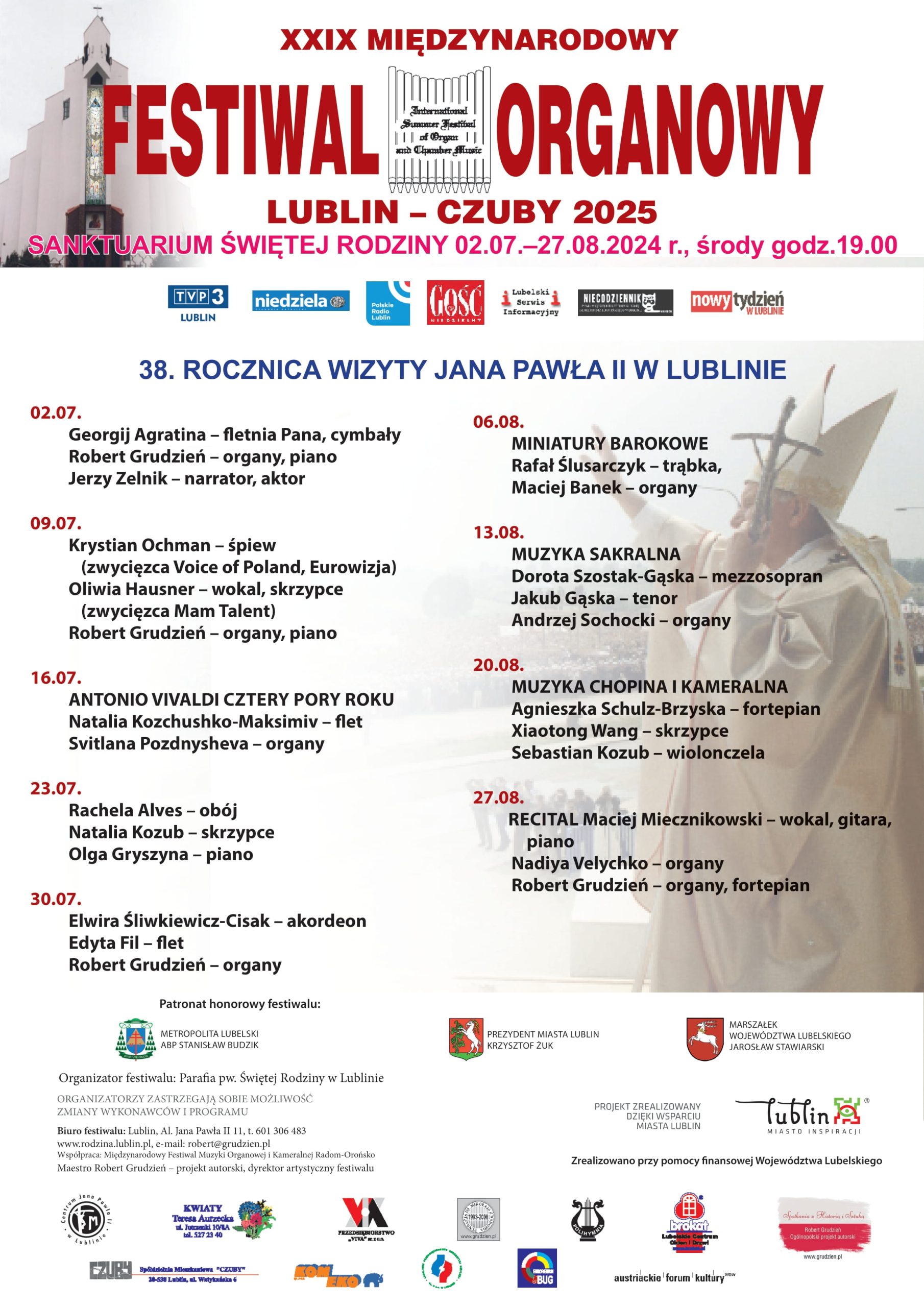 Od środy, 2 lipca 2025 r., rozpoczyna się cykl wakacyjnych koncertów w ramach XXIX Międzynarodowego Festiwalu Organowego Lublin-Czuby 2025. Koncerty odbywać się będą tradycyjnie w wakacyjne środy – od 2 lipca do 28 sierpnia 2025 r. – o godz. 19.00, w Sanktuarium Świętej Rodziny w Lublinie (ul. Jana Pawła 11).