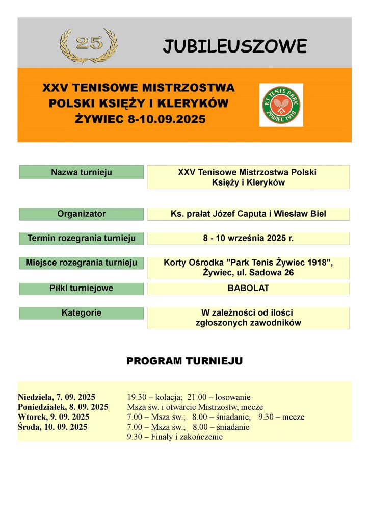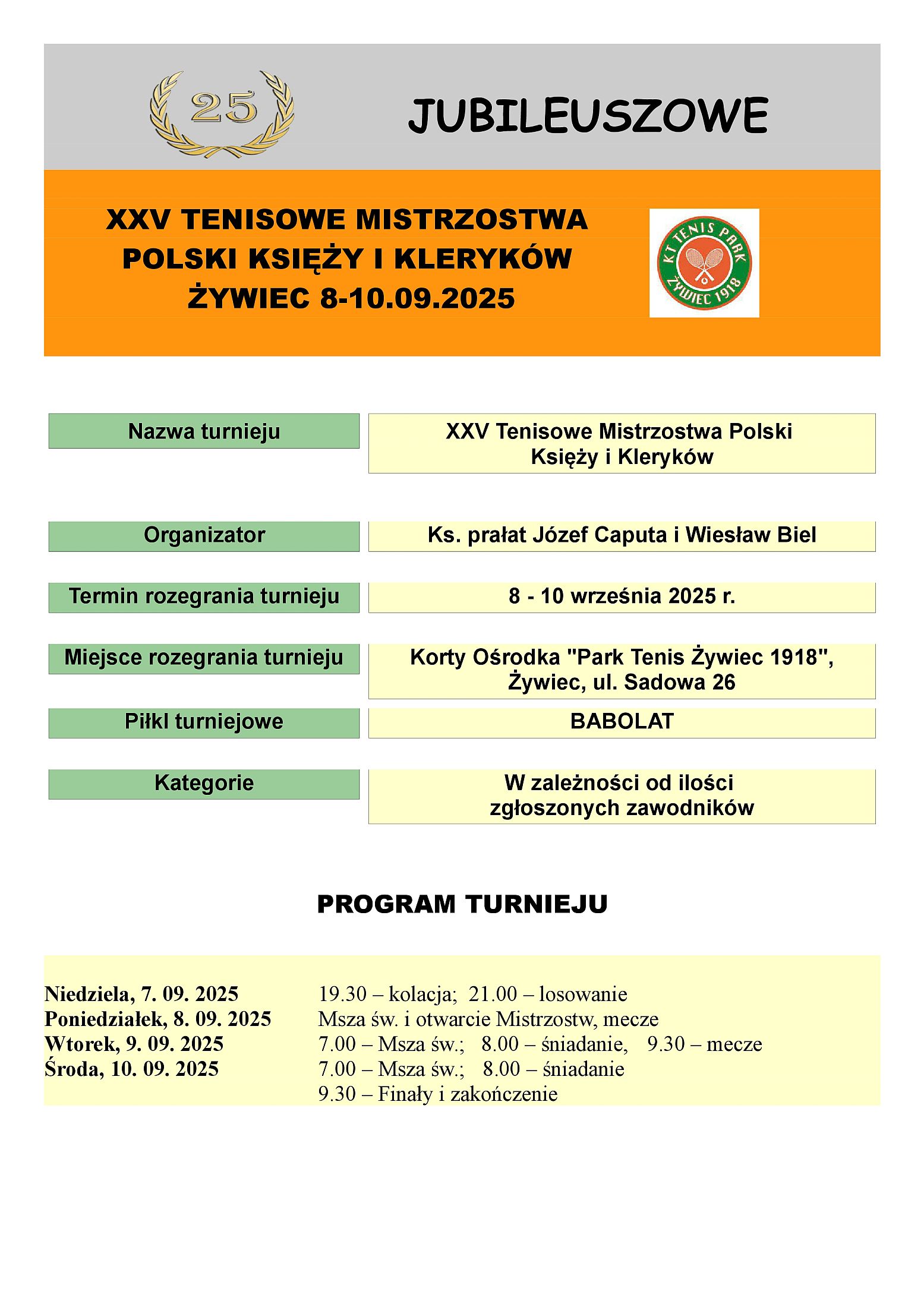 W dniach 8-10 września 2025 r. odbędą się w Żywcu XXV Tenisowe Mistrzostwa Polski Księży i Kleryków. Rozgrywki będą miały miejsce na kortach Ośrodka „Park Tenis Żywiec 1918” w Żywcu.