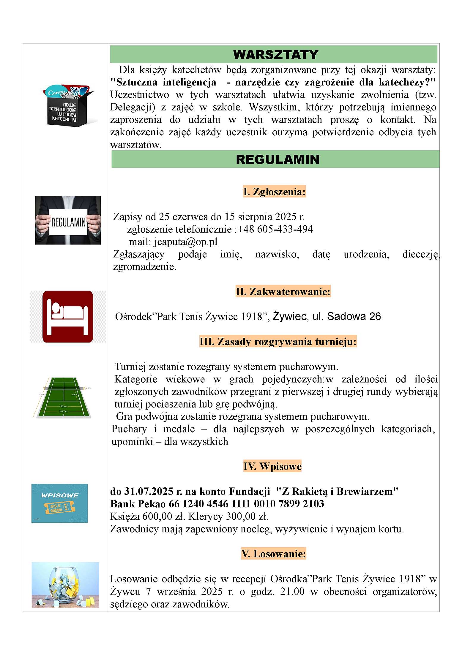 Uczestnicy będą podzieleni na poszczególne kategorie wiekowe. Rozgrywki będą w grze pojedynczej oraz w grze w podwójnej. Dla księży katechetów będą zorganizowane przy tej okazji warsztaty: „Sztuczna inteligencja – narzędzie czy zagrożenie dla katechezy?