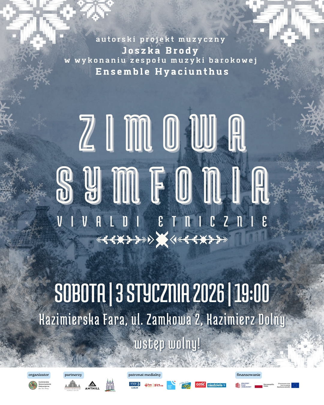 Wydarzenie Zimowa Symfonia zaprasza na wyjątkowe koncerty barokowe w zimowej odsłonie, łączące muzykę dawną z nowoczesną warstwą interpretacyjną, edukacją artystyczną i rozwiązaniami multimedialnymi. W ramach przedsięwzięcia w kościele farnym w Kazimierzu Dolnym oraz w Archikatedrze Lubelskiej zabrzmi specjalnie przygotowane preludium inspirowane dziedzictwem polskiego baroku oraz cykl Cztery pory roku Antonio Vivaldiego, a ideą projektu jest popularyzacja repertuaru barokowego, integracja środowisk twórczych oraz pokazanie potencjału twórczego wykorzystania sztucznej inteligencji w kulturze.
